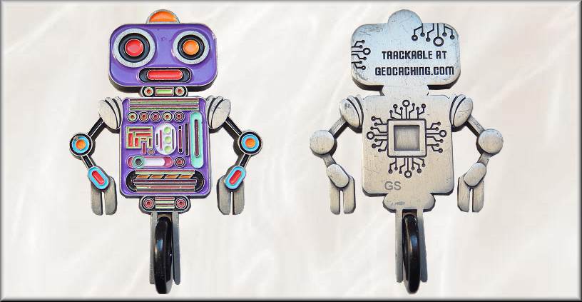 Mr. Roboto | Mr. Roboto ist ein kleiner Roboter, welcher sich aus Forschungsgründen die Aufgabe gestellt hat, die Welt zu erkunden. Er will an viele Orte reisen und etwas über sie erfahren. Gestartet ist er im April 2022 in Schleswig-Holstein und hat in vier Jahren die weite Strecke von 393.554 km zurückgelegt. Dabei half ihm vor allem die Begleitung des Weltreisecachers jowo2003, denn mit ihm tourte Mr. Roboto durch Afrika, Südamerika und Südostasien. Die "Mr. Roboto Geocoin" auf Zinkbasis erschien Anfang 2021 bei Geoswag in einer Auflage von ca. 650 Stück in den drei Editionen Antik Silber, Satin Silber und Black Nickel. Sie ist 53 x 80 x 6 mm groß und hat ein bewegliches Rad. |