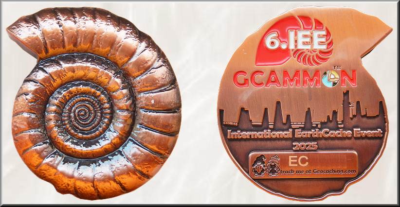 6. Internationales EC-Event 2025 Trackable "Ammonite" | Der Museumspark Rüdersdorf war am 11. Oktober 2025 Schauplatz des 6. IEE - 6. Internationales EarthCache Events, vorbereitet von den "Erdzwerge"n, einer Gruppe von earthcachebegeisterten Cachern und vielen weiteren Helfern. Natürlich hatten die Erdzwerge in ihren unterirdischen Bergwerken fleißig Erze geschürft, um sie zu tollen Geocoins zu verarbeiten. Dabei half ihnen Mario vom LaserLogoShop. Im Ergebnis entstanden die drei hier vorgestellten Münzen, die mit dem Nothosaurus, einer Turmschnecke und einem Ammoniten Fossilien vorstellen, die im Kalkstein Rüdersdorfs gefunden wurden. Am bekanntesten ist sicherlich die Form eines detailreichen Ammoniten, inspiriert von Fossilienfunden aus dem Kalksteinbruch, einem Ort mit über 760 Jahren Bergbaugeschichte und vielen geologischen Schätzen. Ammoniten zählen zu den häufigsten Fossilien überhaupt, sind aber im Rüdersdorfer Kalkstein sehr selten zu finden. Sie lebten mehr als 300 Millionen Jahre lang in den Meeren. Dann, vor 66 Millionen Jahren, stürzte ein gewaltiger Asteroid im Gebiet der heutigen Halbinsel Yukatan auf die Erde und beendete nicht nur die Ära jener Tiere mit den charakteristisch gewundenen Gehäusen. Ammoniten sind die häufigsten bekannten Makrofossilien und für die geologische und paläontologische Forschung von unschätzbarem Wert, denn viele Formen stellen wichtige Leitfossilien dar. Das sind Fossilien, anhand derer sich das Alter von Gesteinsschichten abschätzen lässt, in denen sie eingeschlossen sind, also erdgeschichtliche "Zeitmesser". Zum Event erschien die 44 x 50 x 6 mm große detailreiche 3D-Ammonitencoin in Antik Silber in einer Auflage von 180 Stück zusammen mit der "Nothosaurus raabi"-Coin in Antik Kupfer und der "Undularia Scalata"-Coin in Antik Gold, auch jeweils mit 180 Stück. Während die Frontseite ein Abbild des Fossils zeigt, sind auf der Rückseite das Logo des 6. IEE zusammen mit der Silhouette der alten Schachtofenbatterie zu sehen, darunter die Trackinginformationen. Die "Nothosaurus raabi"-Geocoin ist 70 x 42 x 7 mm groß und stellt eine Nachbildung des wohl am besten erhaltenen Skeletts des bis zu 3 m langen Räubers Nothosaurus vor, der als Küstenbewohner an eine amphibische Lebensweise angepasst war und im Kalksteinbruch Rüdersdorf gefunden wurde. Die dritte Geocoin zum 6. IEE ist eine Nachbildung einer "Undularia Scalata" oder auch Turmschnecke genannt, 30 x 60 x 6 mm groß, die in natura bis zu 15 cm groß werden konnte. Da die Nachfrage nach dem Set sehr groß war, entschlossen sich die Erdzwerge, nochmal in ihre Werkstätten zu gehen, die Metallschmelze anzustellen und eine Nachauflage der Ammonitencoin mit je 30 Stück in Silber, in Gold und Kupfer zu gießen. Außerdem wurde noch eine Helfercoin mit 40 Stück gefertigt. |