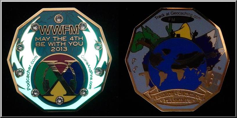 CoinsAndPins Geocoin | Weihnachten 2004 begannen CoinsAndPins aka Aaron und seine Frau TumbleWeed aka Tess mit dem Geocachen. Auslöser war idtimberwolf, der sich Ende 2004 an Coinsandpins.com wandte, um für die Idaho Geocachers Organization (IGO) eine erste, nicht trackbare Idaho-Geocoin herstellen zu lassen, die im März 2005 erschien. Aaron, Chef von Coinsandpins.com und damals hauptberuflich bei der amerikanischen Luftwaffe tätig, hatte vorher bereits 4 Jahre lang nebenberuflich über seine Firma "Aaron Charles Productions", die er später in "CoinsAndPins.com" umwandelte, andere Münzen und Anstecknadeln hergestellt. Er schreibt in seinem Profil: Ich war neugierig auf diesen Sport und er führte mich zu geocaching.com, wo meine Frau und ich uns anmeldeten. Daher kam mein Caching-Name, weil mir zu diesem Zeitpunkt nichts anderes einfiel. Schnell wurde Aaron mit seiner Firma in Cacherkreisen für qualitativ hochwertige Geocoins bekannt. Im Mai 2006 erschien TumbleWeeds eigene Personalcoin und einen Monat später veröffentlichte Aaron die hier vorgestellte, eigene Personalcoin in einer Auflage von 575 Stück in den Editionen Glänzend Gold und Black Nickel. Die Geocoin ist Münze und Anstecknadel in einem, sie bietet ein tolles Konzept und ist gleichzeitig Werbung für CoinsAndPins. Blickfang auf einer Seite ist der 29 x 1 mm große Pin. Zu sehen ist ein Teil der Erde (mit dem kommerziellen „G“), eine Boeing E-3 "AWACS" mit gelben "Radarstrahlen" und eine Munitionskiste. Aaron wählte dieses Design, weil er selbst 12 Jahre lang bei der Luftwaffe diesen Typ gewartet hatte. Auch fand er es passend, da dieses Flugzeug getarnte Flugzeuge aufspürt, so wie Geocacher nach getarnten Caches suchen. Auf dem Rand des Pins steht „Searching with precision equipment“ (Suche mit Präzisionsausrüstung). Durch den Pin verdeckt wird ein sternreicher, schwarzer Nachthimmel mit einer, den Trackingcode tragenden Munitionskiste im Weltraum, aus der Münzen zur Erde rieseln. Auf dem Globus ist „Geocaching in der Nacht“ zu lesen, umlaufend steht in dunkelblauen großen Lettern ★ MÜNZEN IN CACHES SUCHEN ★ MÜNZEN FÜR CACHES HERSTELLEN ★. Die 38 x 2 mm große Geocoin selbst hat in der Mitte eine Öffnung für den Schaft der Anstecknadel. Die andere Seite der Geocoin zeigt den Kopf eines Cachers mit Nachtsichtbrille in dunkler Emaille und den Cachernamen CoinsAndPins. Sowohl die Münze als auch der Pin leuchten im Dunkeln. Aaron liebte es, Geocoins in Caches zu finden, mochte das Nachtcaching sehr und nutzte dabei manchmal ein Nachtsichtgerät. Wohl deshalb aktivierte er fast 100 Coins selbst und schickte sie mit den unterschiedlichsten Aufgaben in die Cacherwelt hinaus. Aktuell ist noch eine der Coins aktiv, 24 sind bei Cachern gelistet und und 71 sind verschwunden. Vielen Dank an DinkinFlicka392, der diese ganz besondere Geocoin im Rahmen eines Tausches ins Oderland schickte. |