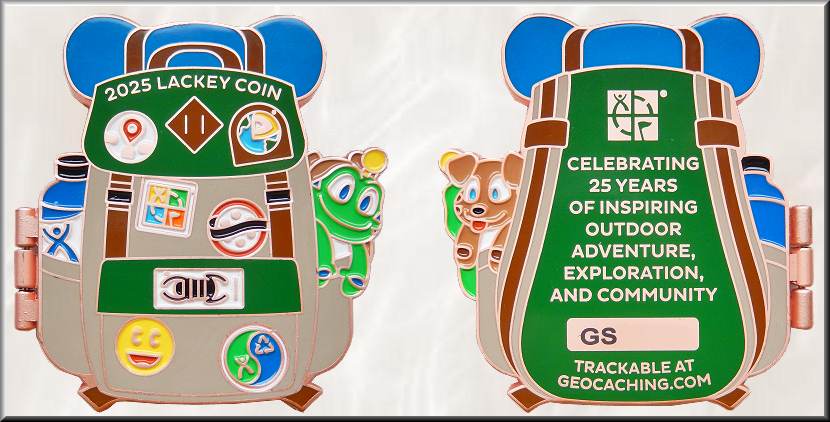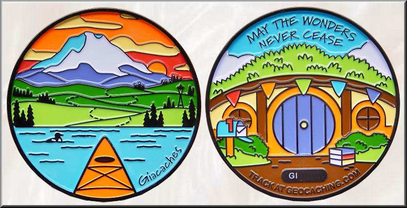 Chris Mackey (ein bekannter US-Coingestalter) fertigte diese Coin für den GeoCoinClub. Gedacht für Senioren ist der Tracking-Code besonders groß gehalten. Auch sonst ist die Coin mit 2 Zoll = 51 mm Durchmesser und 4 mm Stärke recht groß. Am 21.08.2012 setzten wir eine Coinkopie in dem, im Geburtsjahr des Geocachings veröffentlichten, Cache "Creekside Stash" am Stadtrand von Santa Rosa aus. 08.10.2016 Im März 2018 tauchte sie rund 230 km weiter wieder auf und reiste bis 2021 weiter von Cache zu Cache. Am 28.05.2021 wird die Coinkopie letztmalig im Cache "A14 AS Dahlenwarsleben" in Sachsen-Anhalt gesichtet. Danach verliert sich ihre Spur. |