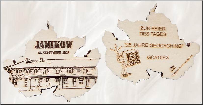 Block Party Jamikow Trackable | Groundpeak veranstaltete zum 10-jährigen Jubiläum von Geocaching am 4. Juli 2010 eine offizielle "Lost & Found Celebration" in ihrem Hauptquartier in Seattle, WA, wo die Teilnehmer mit den Groundspeak-Lackeys feiern konnten. Dieses Event erhielt sogar ein eigenes "Groundspeak Lost and Found Celebration"-Icon. Aus diesem Jubiläumsevent wurde zwischen 2011 und 2015 am Hauptsitz von Groundspeak in Seattle ein jährliches Event, "Geocaching Block Party" genannt. Es war ein Mix aus Straßenfest, Meet & Greet mit den Entwicklern und einem Cacher-Happening direkt dort, wo Geocaching entstanden ist. Nur 5064 Geocacher erhielten bei den in Seattle veranstalteten vier Blockpartys durch ihre Logs das Blockparty-Icon. Für die weltweite Geocaching-Community gab es 2025 zum 25-jährigen Jubiläum von Geocaching unter dem Motto „Celebrating 25 Years of Geocaching“ die Möglichkeit, Blockpartys überall auf der Welt zu feiern, nicht nur in Seattle oder den USA. Voraussetzung war, dass die als Blockparty vorgesehenen Events den Mega- (mind. 300 Will Attends) oder Giga-Event-Status (mind. 3000 Will Attends) erreichten. Somit hatten also Geocacher fast überall auf der Erde die Möglichkeit, das bislang so schwer erhaltbare Blockparty-Icon zu bekommen. Der seit März 2012 sehr aktive Cacher RF1984 aka Rico aus Grünow in der Uckermark hatte 2024 zusammen mit seiner Frau den Traum, für die Community eine Blockparty im Norden Brandenburgs bei Schwedt zu organisieren. Mit seinem Elan steckte er weitere Geocacher an, die sich zum Team CacherFreundeNordost zusammenschlossen und im rund 25 km entfernten, 165 Einwohner zählenden Jamikow Partner fanden, um gemeinsam eine große Blockparty auf die Beine zu stellen. Nach über einem Jahr intensiver und oft mühevoller Vorbereitung startete dann am 13. September 2025 bei schönem Wetter auf dem großen Gelände des spätbarocken Gutshauses in Jamikow die Blockparty "Zur Feier des Tages "25 Jahre Geocaching"". Es wurde ein ganz tolles Event mit interessanten Angeboten zum Cachen, Platz zum Plaudern mit Cacherfreunden, einem abwechslungsreichen Versorgungsangebot und vielen sehr freundlichen Helfern. Extra für die Block Party zur Feier von "25 Jahre Geocaching" in Jamikow wurde diese sehr schöne Holzcoin in einer Auflage von 300 Stück herausgegeben. Disign und Herstellung lagen in Händen von Julia, die in Eberswalde den Laserschneide- und Gravurservice Julias.DIY.Stübchen betreibt und die Woodcoin am Eventtag an ihrem Stand verkaufte. Die 90 x 75 x 7 mm große Woodcoin im Umriss des Landkreises Uckermark zeigt auf der Vorderseite das denkmalgeschützte Gutshaus Jamikow mit dem Datum der Block Party. Auf der Rückseite findet man den Titel und den GC-Code des Events, das Blockparty-Logo sowie die Trackingnummer. |