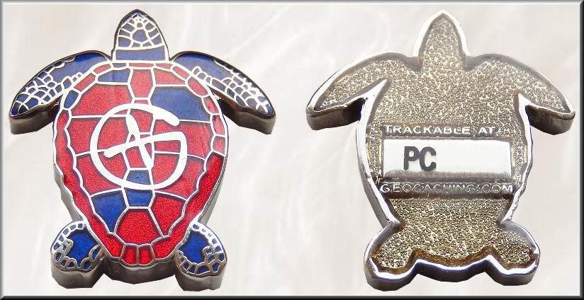 Baby Loggerhead! Geocoin | Im April 2006 erschien die zweite Geocoin von Mr & Mrs Loggerhead, herausgegeben für ihre Tochter BabyLoggerHead, die zu jener Zeit aber schon im Teenageralter war. Gefertigt wurden von CoinsAndPins 3 Editionen in Poliert Silber (500), Black Nickel (100) und Gold (50). Die Frontseite der 38 x 42 x 3,5 mm großen Münze ist bis auf die pinke Farbgestaltung identisch zur ersten "Loggerhead Turtle Geocoin" der Familie. Auf der Rückseite sind Jungtiere der Unechten Karettschildkröte auf einem Sandstrand abgebildet, die in Richtung Meer huschen. Außerdem sind der Wegpunkt WPGG4508 für den 2020 archivierten virtuellen Cache „Turtle Hospital“ und die Webadresse des Meeresschildkrötenkrankenhauses auf Topsail Island in North Carolina zu sehen, eine Einrichtung, die sich der Pflege und Freilassung kranker und verletzter Meeresschildkröten widmet. |