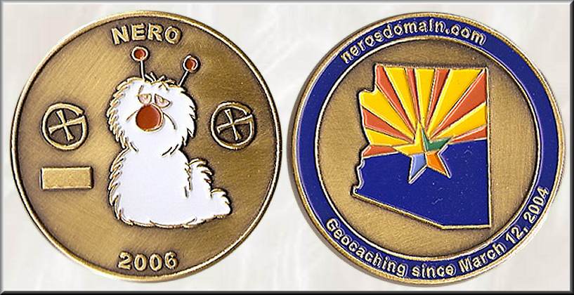 Nero Geocoin | Im März 2004 meldete sich Chris aus Phoenix in Arizona, Busfahrer und aktiver Amateurfunker, bei Groundspeak mit dem Nick Nero an. Ihm gefiel das neue Hobby und so ging er allein oder mit seinen drei Jungs in der Freizeit auf Cachesuche. Bald begann er sich für die in manchen Caches zu findenden Trackables zu interessieren und fing an, Geocoins zu sammeln. So hatte er Anfang Oktober 2004 bereits eine silberne USA-Geocoin von 2004, eine California-Geocoin, einen "Greenman", eine „Joy of Geocaching“-Münze und freute sich darauf, neue bestellte Geocoins zu bekommen. Ende 2005 hatte sich Chris entschlossen, eine eigene, nicht trackbare Personalcoin mit seinem Avatar, von Rusty über personalgeocoins.com fertigen zu lassen. Die von ihm gewählte flauschige Raupe namens "Nero" auf der Frontseite der Coin stammt aus dem britischen Zeichentrickfilm "Danger Mouse", der 1981 entstand und 1984 in die USA kam. Obwohl Nero im Geocaching-Forum recht aktiv war, sind kaum Informationen zu dieser Coin zu finden. Mitte Februar 2006 hatte er seine erste eigene Geocoin in einer Auflage von 100 Stück in Bronze in Händen. (Quelle) Da die Coins recht schnell durch Tausch, ... weg waren, erhielt Chris Mitte Mai eine Nachbestellung von 40 Coins in Silber und 10 in Gold. Anfang Oktober 2006 kündigte Chris im Geocaching-Forum das baldige Erscheinen seiner nächsten, nun trackbaren Geocoin an. Eine Woche später begann der Vorverkauf und Mitte Oktober stellte Nero Fotos der angekündigten Coins vor. Gemünzt wurden je 100 Stück in Nickel, Black Nickel und Gold, wobei eine Goldcoin nur in Verbindung mit 5 anderen Coins gekauft werden konnte. So hatte Chris neben 5 extra gefertigten Glänzend Kupfercoins weitere Goldcoins zum Tausch übrig. Am 10. November 2006 kam die Sendung mit den bestellten Münzen bei Chris an, der in den folgenden Tagen alle Bestellungen verschickte. Die 32 x 44 x 4 mm große Geocoin in Form der auf der Frontseite mürrisch dreinschauenden Raupe "Nero" zeigt auf der Rückseite von oben nach unten den Cachernamen, das offizielle Groundspeaklogo, Wohnort und Bundesstaat, die Trackinginformationen, das Siegel von Phoenix und Flagge von Arizona sowie Informationen zum Cachebeginn. Wahrscheinlich nahm Chris seine letzten Tauschcoins zum GeocoinFest 2007 mit, das am 17. Februar in Temecula, Kalifornien stattfand. Dort sprachen ihn dann wohl so viele Geocoin-Süchtige wegen seiner Personalcoin an, dass er sich nach seiner Rückkehr entschloss, eine Nachauflage herauszubringen. Gemünzt wurden weitere 100 Coins in Black Nickel und je 60 Antikcoins in Gold, Silber und Kupfer, die nur im Set verkauft wurden. Insgesamt gibt es also von der "Nero Geocoin" 585 Stück in 7 Editionen. Am 06. Oktober 2007 organisierte Chris in seinem Bundesstaat das Geocoinfest Multi Event (Arizona). An diesem Tag fanden anstelle einer großen Veranstaltung weltweit 24 regionale Events gleichzeitig statt. Ende 2009 ließen Neros Cacheaktivitäten langsam nach, und im Sommer 2016 loggte er seinen bis jetzt letzten Cachefund. |