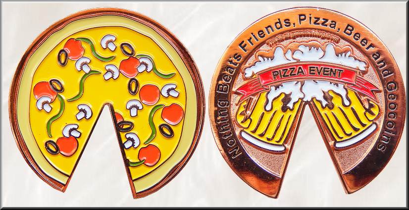 Pizza Event Geocoin | Groundspeak hatte Anfang 2010 die weltweite Cachercommunity aufgerufen, Feiern zum 10-jährigen Jubiläum des Geocachings vorzubereiten, die vorgegebenen Richtlinien entsprechen mussten und in der Zeit vom 30. April bis 3. Mai 2010 durchzuführen. Jedes durchgeführte Event, z. B. „10 Years! Tacoma, WA.", erhielt dann ein besonderes Jubiläumssymbol. Gerade in den USA trafen sich Cacher oft in Pizzas und so hatten die Designer von Oakcoins/Geoswag wahrscheinlich die Idee, die hier vorgestellte Geocoin in Vorbereitung auf die Feierlichkeiten in einer Auflage von 150 Stück in Kupfer herauszugeben. Zur Coin gehört eigentlich noch ein Anstecker in Form des fehlenden Pizzastückes. Die Geocoin ist 33 x 4 mm groß, auf einer Seite wie eine Pizza mit Tomaten, Pilzen, Zwiebelringen und Kräutern belegt. Auf der anderen Seite sind zwei gefüllte Bierkrüge beim Anstoßen zu sehen und ein rotes Spruchband mit der Aufschrift PIZZA EVENT. Umlaufend ist zu lesen: "Nothing Beats Friends, Pizza, Beer and Geocoins", also "Nichts geht über Freunde, Pizza, Bier und Geocoins". |