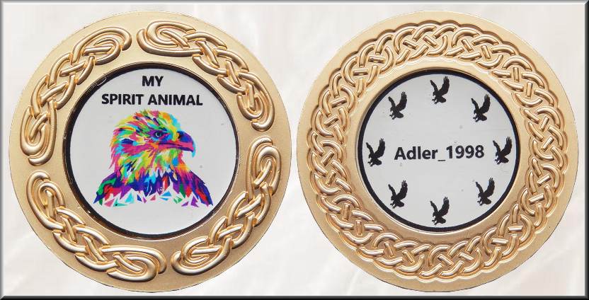 GeoDime "Adler_1998" | Im Juli 2023 ließ sich Adler_1998 aka Florian, seit September 2011 Geocacher und zunehmend auch der Geocoinsammelleidenschaft verfallend, diese persönliche GeoDime-Coin vom online-Shop laserbu.de in einer Auflage von 25 Stück in Satin Gold fertigen. Sie ist 45 x 5 mm groß und wiegt 38 g. Florian schenkte mir eine dieser Coins während des MEGAs 6. IEE - 6. Internationales EarthCache Event in Rüdersdorf, als wir im Rahmen der dortigen Geocoinausstellung einen Teils unserer eigenen Sammlungen in der alten Schachtofenbatterie präsentierten. Auf der Frontseite ist im Zentrum der Geocoin der in glasklarem Harz eingebettete, sehr bunte Kopf eines Adlers als sein SPIRIT ANIMAL zu sehen. Im Zentrum der Rückseite steht Florians Nickname, umgeben von der achtfachen schwarzen Silhouette eines fliegenden Adlers in Greifposition. Ein breiter Metallrand mit unterschiedlichem Muster auf beiden Seiten sorgt für eine gute Haptik. Interessant ist die Geschichte zur Entstehung der GeoDime-Serie. Im Mai 2008 meldete sich Alex aus der Nähe von Braunschweig bei geocaching.com mit dem Nick Joe Kerr an. Zusammen mit Tysja aka Antje , die seit Januar 2009 Dosen sucht, gründete er 2013 den online-Shop laserbu.de. Dem voran ging ein Laserkauf, um ein paar Ersatzteile für Alex Flippersammlung und für Antje einen eigenen Trackable zu fertigen. Schnell entwickelte sich das Geschäft und so kaufte die Laserbude zur Verwendung für ihre Kunden bei Groundspeak eigene Icons. Wahrscheinlich im Herbst 2015 entstand die Idee für die GeoDime, eine Geocoin mit eigenem Icon in Verbindung mit 515 Trackingcodes, die mit einem individuellen Motiv gestaltet werden kann. Zur Auswahl stehen aktuell sieben unterschiedliche Metallauflagen. |