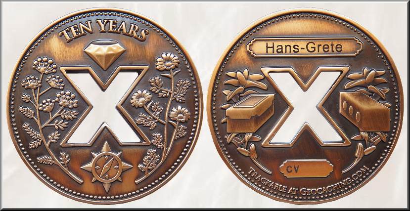 10 Years of Geocaching Multi Event Geocoin | Die 45 mm große und 3 mm dicke Coin ist glänzend golden mit violetten, transparenten und gelben Verzierungen mit einer 2D-Prägung. Diese Coin gibt es in 38 unterschiedlichen Versionen. Am 02.05.2010 wurde Geocaching 10 Jahre alt, weltweit wurden zur Feier des Tages viele Treffen organisiert. Seit dem 24.04.2013 liegt eine Coinkopie im Cache "Energiemix 3 - Wind" und sollte dort bleiben. Im Februar 2019 wurde die Kopie dann aber aus dem Cache mitgenommen und reiste bis April 2021 von Cache zu Cache. Nach dem 29.04.2021 verschwindet sie aus einem Cache in Belgien. |