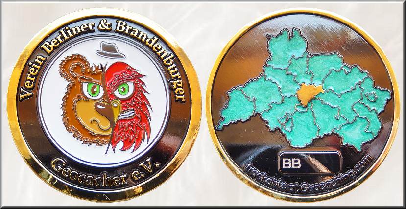 Verein Berliner und Brandenburger Geocacher | Der Verein Berliner und Brandenburger Geocacher e.V. wurde 2018 im Rahmen der Vorbereitungen des Gigaevents "Berlin – Hauptstadt der Spione" gegründet. Nach einem tolle GIGA-Wochenende beschlossen die noch verbliebenen Vereinsmitglieder, auch nach dem Event etwas für die Community zu tun und setzten für den Verein neue Ziele und Aufgaben. So unterstützt der Verein den Wettbewerb „Cache des Jahres Berlin“ und stellt sich der Aufgabe, die Geocaching-Community in Berlin und Brandenburg etwas mehr zusammenzubringen, um gemeinsame Erlebnisse zu schaffen. Dies geschieht vorzugsweise durch unterschiedlich gestaltete Events an verschiedenen Orten und in unterschiedlicher Größe. Am 13. Februar 2025 präsentierte der Vereinsvorstand während der Jahreshauptversammlung eine im stillen umgesetzte Idee: Die Vereins-Coin in einer Auflage von 100 Stück! Sie soll helfen, den Verein bekannter zu machen und neue Mitglieder zu gewinnen! Wir entdeckten diese besondere Geocoin in Wünsdorf bei Berlin am Stand des Vereins beim tollen Event „Die große Geocaching Bunker Block Party 2025“ und mussten sie natürlich kaufen. Die 50 x 4 mm große und 38 g schwere Glänzend Goldgeocoin zeigt auf der Frontseite auf weißem Grund das Logo des Vereins, eine Symbiose aus Berliner Bär und Brandenburgadler. Darüber erinnert der kleine schwarze Hut (Logo des GIGAS "Berlin – Hauptstadt der Spione") an die Geschichte der Gründung. Im umlaufenden, schwarz unterlegten Kreisring ist der Vereinsname zu lesen. Auf der Rückseite ist auf schwarzem Untergrund eine Karte der beiden Bundesländer zu sehen, Brandenburg gegliedert in seine Landkreise und kreisfreien Städte, die eine sehr schöne durchscheinende Textur haben. |