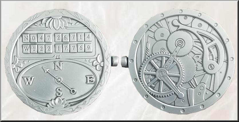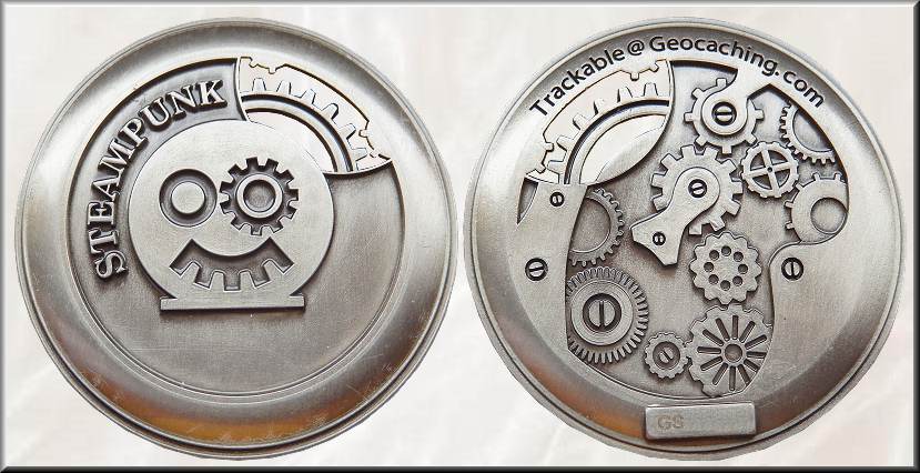 Scorchi's Gear | Steampunk ist ein Phänomen, das als literarische Strömung in den 1980ern begann und sich zu einem Kunstgenre ausweitete. Dabei werden einerseits moderne und futuristische technische Funktionen mit Mitteln und Materialien des viktorianischen Zeitalters verknüpft, wodurch ein deutlicher Retro-Look der Technik entsteht. Häufige Elemente des Steampunk sind dampf- und zahnradgetriebene Mechanikelemente. Die wahrscheinlich erste Geocoin im Steampunk-Design entstand im Juli 2010 in Vorbereitung auf die "Steamcon II", die vom 19. bis 21. November 2010 im Hilton Seattle Airport Hotel und im Seattle Airport Marriott in Seattle, Washington, stattfand. Die Koordinaten führen nach Seattle, der Heimat des Geocachings und auch dem Geburtsort der Steampunk-Convention. Der bekannte nordamerikanische Cacher und Geocoindesigner fox-and-the-hound aka Chris Mackey ist ein großer Fan von Steampunk-Kunst, die mechanische Präzision mit fließenden, geschwungenen floralen Schnitzereien verbindet. So ist es nicht verwunderlich, dass im Laufe der folgenden Jahre noch andere Steampunk Geocoins erschienen, darunter auch die hier vorgestellte "Steampunk Gear GeoCoin". Die im Dezember 2014 erschienene Geocoin, 50 x 3,5 mm groß, wurde in Antik Silber (mit Klarlack überzogen) und in Antik Bronze gemünzt. Sie ist auf der Frontseite recht einfach gehalten und erlaubt auf der Rückseite einen Blick in die Zahnradmechanik eines technischen Spielzeuges. Die hier vorgestellte Geocoin wurde im Februar 2021 in Bayern aktiviert und legte bisher in Europa rund 4800 km zurück. Ihr weitester Trip führte sie 2025 nach Mallorca. |