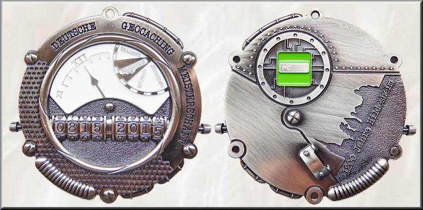 Geocacher's Day Geocoin | Diese Geocoin mit 4,4 cm Durchmesser stellt den möglichen Tagesablauf eines Geocachers von 0.00 bis 24.00 Uhr dar: 00.00 - 03.00 Uhr - Träumen vom Cachen, 03.00 - 06.00 Uhr - Auswahl des Caches, 06.00 - 09.00 Uhr - Auf zum Cache, 09.00 - 12.00 Uhr - Cache gefunden!, 12.00 - 15.00 Uhr - Loggen des Caches, 15.00 - 18.00 Uhr - Virtueller Cache zwischendurch, 18.00 - 21.00 Uhr - Auf zum Nacht-Cachen, 21.00 - 24.00 Uhr - Stöbern im Forum. Auf der Rückseite steht der Spruch: Der Tag ist gekommen und die Stunden sind vergangen. Aber ein anderer Cache ist in dieser Zeit gefunden. (Quelle: www.geocoinshop.de ) Die Coin ist ein Geschenk an die Compubaerin für ihren unermütlichen Cacheeinsatz. Eine Kopie dieser Coin startete am 27.03.2014 zu ihrer Reise von Cache zu Cache. Nach 89 km seit 30.03.2014 in den Händen von KingDrago, der auf Anfragen nicht reagiert. |