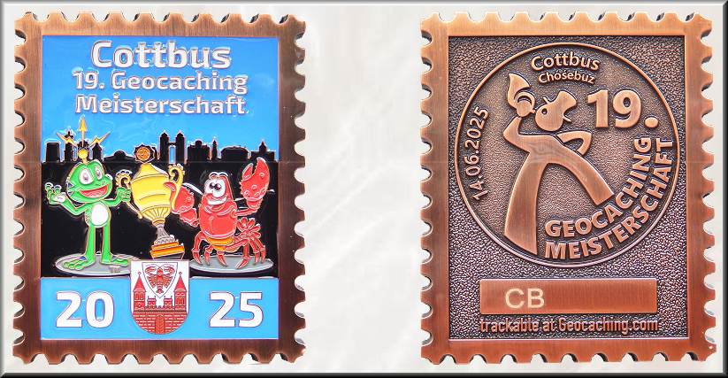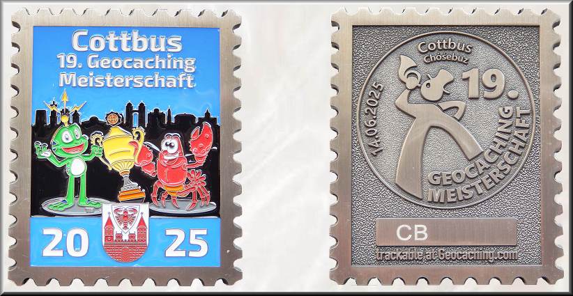 Vom 13. bis 15. Juni 2025 verwandelte sich Cottbus in das Zentrum der deutschen Geocaching-Szene: 19 Teams aus dem gesamten Bundesgebiet trafen sich zur 19. Deutschen Geocaching Meisterschaft (GCM), zu einem Wochenende voller Rätsel, Abenteuer und Gemeinschaft. Eingeladen hatte das Team „Mystery Masters Lausitz“, denn nach dem Triumph im vergangenen Jahr in Suhl trug es in diesem Jahr die Meisterschaft als amtierender Deutscher Meister aus. Einen ausführlichen Bericht zur Vorbereitung und zum Ablauf der 19. GCM veröffentlichte palk als einer der Organisatoren auf gc-lausitz.de. Die Geocoin zur 19. GCM in Form einer Briefmarke erinnert an den bereits seit über 150 Jahren zum Werbeträger für Cottbus gewordenen Postkutscher. Die Gesamtgestaltung und Fertigung erfolgte über den LaserLogoShop. Die 50 x 60 x 5 mm große Helfercoin in Kupfer zeigt auf der Vorderseite Signal und den Krebs als Wappentier von Cottbus mit einem Pokal vor der Skyline der Stadt. Die Figuren gestaltete der deutsche Grafiker und Geocoin-Designer Jascha Buder aka Bruder JaB. Auf blauem Untergrund steht oben "Cottbus 19. Geocaching Meisterschaft" und unten die Jahreszahl 2025, getrennt durch das Stadtwappen. Auf der metallenen Rückseite sind das Logo der 19. Geocaching Meisterschaft in Stempelform mit dem stilisierten Postkutscher und die Trackinginformationen zu sehen. Aufgelegt wurde die Geocoin in den Editionen Antik Silber RE110 und in Kupfer LE57. Für die drei Siegermannschaften entstanden je 11 Coins in Antik Gold, Nickel und Antik Bronze. Die restlichen der 225 Trackingcodes wurden wahrscheinlich für Helfer-T-Shirts genutzt. Die hier vorgestellte Helfer-Coin ist ein Geschenk als Dank für die Gestaltung einer der 11 Stationen zur Geocointhematik im Alten Münzturm von Cottbus. Über diese Geocoin habe ich mich sehr gefreut und bedanke mich beim Orgateam dafür. |