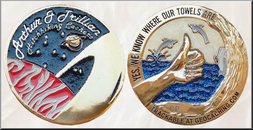 Arthur & Trillian Geocoin | Im Januar 2006 startete eine Familie aus Zentral-Missouri das neue Hobby Geocaching und meldete sich bei Groundspeak unter dem Nick Arthur & Trillian an. Die Wahl ihrer Geocaching-Nicks folgte der Vorliebe für Douglas Adams' „Per Anhalter durch die Galaxis“-Reihe, in der Arthur die glücklose Hauptfigur ist und Trillian eine abenteuerlustige, intelligente und desillusionierte menschliche Radioreporterin vom Sub-Etha-Atoll. Vor allem Arthur aka Michael war von Beginn an recht aktiv im Geocaching-Forum und begann auch bald, Geocoins zu sammeln. Ende September 2006 besuchten sie ihr erstes Event, das "2006 SLAGA Fall Picnic" und vielleicht entschieden sich beide damals, Mitglied in der "St. Louis Area Geocachers Association" (SLAGA) zu werden. Jedenfalls beschrieb Arthur seine Homezone als "Die unerforschten Randgebiete der SLAGA-Grenze". Das "MOGA 2007 - Midwest Open Geocaching Adventure" war dann im März das erste große Event, an dem sie zusammen mit ihrem kleinen Sohn, den jungen Zaphod, teilnahmen. Auch dort wird Arthur besondere Geocoins entdeckt und Geschichten über sie gehört haben. Ein besonderes Erlebnis war für ihn Anfang November 2006 der Fund einer "Geocoin Fairy"-Mysterycoin, die 2006 und 2007 als nicht trackbare Geschenkcoins in Caches abgelegt wurden und vom jeweiligen Finder behalten werden konnten. So verwundert es nicht, dass er im April 2007 im Geocaching-Forum seine ersten Vorstellungen von einer eigenen Geocoin veröffentlicht, deren Design sich ebenfalls auf die „Per Anhalter durch die Galaxis“-Reihe bezieht. Mitte Mai war das Projekt bereits in der Fertigungsphase, denn CoinsandPins hatten den Auftrag übernommen. Geplant waren 310 Geocoins in fünf Editionen: Antik Bronze RE100, Antik Silber LE75 und Poliert Gold LE75 (im Verkauf über C&P) sowie Antik Kupfer XLE50 und Satin Gold AE10, die Arthur & Trillian zum Handel nutzen konnten. Am 27. Juli waren die fertigen Münzen beim Owner angekommen, der Verkauf bei CoinsandPins startete ab dem 05. August 2007. Das Design der hier vorgestellten 44 x 4 mm großen polierten Goldcoin stellt auf beiden Seiten Beziehungen mit der von Adams Ende der 70er Jahre zuerst als Hörspielserie geschriebenen und vom BBC-Radio ausgestrahlten Geschichte her. Auf der Frontseite bezeichnen sich "Arthur & Trillian" als "Hitchhiking Cachers", also als "Tramper-Cachers", die gern zu Cachetouren mitgehen und so schließlich 36 von 51 Bundesstaaten besuchten. Auch das kugelförmige Raumschiff "Herz aus Gold" wird vor einem schwarzen, sternenbedeckten Nachthimmel gezeigt, dazu ein brennender Planet mit breitem Goldring. Auf der Rückseite greift der herausgestreckte Arm mit dem nach oben gehaltenen Daumen vor einem dunkelblauen, wellenbewegten Meer das Tramperthema auf. Die zwei springenden Delfine erinnern an die in der Geschichte erwähnte These, dass die Menschen nur die drittintelligenteste Lebensform auf dem Planeten Erde waren – hinter den Delfinen und den Mäusen. Rechts am Rand ist ein weißes Handtuch zusammen mit einem GPS zu sehen, das an seinem Riemen hängt, dazu versteckt schaut etwas weiter unten eine Ammo-Box hervor. In „Per Anhalter durch die Galaxis“ wird erklärt, warum ein Handtuch für einen Weltraum-Tramper eine ganz besondere Bedeutung hat: Zuerst einmal einen großen praktischen Wert, denn man kann sich darin einwickeln, um Wärme zu speichern, wenn man über die kalten Monde von Jaglan Beta wandert oder auf ihm liegen, wenn man auf den brillantenen Marmorsandstränden von Sangeinus V liegt und die berauschenden Meeresdämpfe einatmet. Vor allem aber besitzt ein Handtuch einen immensen psychologischen Wert, denn Jeder, der per Anhalter die ganze Galaxis bereist, sich durchschlägt, unter widrigsten Umständen überlebt und sein Handtuch dabei hat, ist eindeutig ein Mann, mit dem man rechnen muss. Umlaufend ist zu lesen: YES, WE KNOW WHERE OUR TOWELS ARE (Ja, wir wissen, wo unsere Handtücher sind). Aus den vielen Forenbeiträgen und den Logeinträgen mit Fotos lässt sich die Geschichte von Arthur & Trillian noch weiter erzählen. Während sie in ihren ersten Jahren als Geocacher jährlich dreistellige Fundraten hatten, wurden diese ab 2011 regelmäßig verdoppelt. So hatten sie vor allem Freude an Challenge-Caches. Die FTF-Jagd war von Beginn an eine weitere Leidenschaft, die dazu führte, dass Arthur von November 2015 bis April 2019 in Serie mindestens einen Monats-FTF machte, insgesamt 761 ab 2006. Im April 2016 gab es in ihrer Foto-Galerie das letzte gemeinsame Foto des Paares. Es entstand während des MEGA-Wochenendes MOGA 2016 in Cincinnati, Ohio. Es war ihr Lieblings-Event, ihr zehntes MOGA in Folge! Ab März 2017 erfolgte das Loggen unter dem neuen Nick ArtieD. Über die Ursache kann nur spekuliert werden, doch im September 2016 stellte Michael, gerade mal 41 Jahre alt, im Geocaching-Forum die Frage "Menschliche Asche als Reise-Bug?" und schreibt dazu: Ich liebe Geocaching... Ich liebe es so sehr, dass ich diese verrückte Idee hatte. Wenn ich versterbe, möchte ich eingeäschert werden. Nachdem das erledigt ist, möchte ich ein paar Bison-Container (kleine, zylindrische Metallbehälter, der sich für Mikro-Caches eignen) mit meiner Asche gefüllt und dann irgendwie dauerhaft versiegelt haben. Hängt ihnen eine "Hundemarke" an und voilà... Ich bin jetzt ein Trackable mit der Mission, mich zu Veranstaltungen, beliebten Caches usw. zu bringen. So könnte ich immer noch am Geocaching teilnehmen! Seinen letzten Cache fand Michael am 02. August 2019 - es war ein FTF! Am 14. September erschien im Geocaching-Forum der Thread "Death of an Earthcache Owner", in dem mit Hinweis auf den verstorbenen ArtieD gefragt wurde, was mit EarthCaches passieren sollte, die vom Owner nicht mehr betreut werden können. Sehr dankbar bin ich der Coinsammlerin amtg aus Florida, die mir diese Geocoin für das online-Projekt "Kleine Geschichten aus den ersten Geocoinjahren" schenkte und ins Oderl