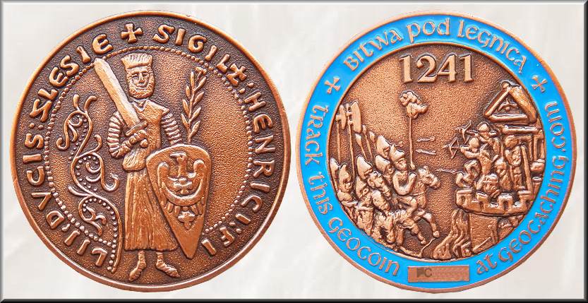 Bitwa pod Legnicą Geocoin | Am 9. April 1241 trafen in der Schlacht bei Legnica zwei Welten aufeinander. Auf der einen Seite standen die Mongolen, in Europa als Tataren bekannt, die aus den Tiefen der asiatischen Steppe gekommen waren. Ihr von zahlreichen Siegen geprägter Marsch führte sie auch nach Polen, das durch seine feudalen Zersplitterungen geschwächt war. Die schlesischen Ritter unter Herzog Heinrich II. dem Frommen verteidigten mit Unterstützung von deutschen Ordensrittern ihr Land. Die Mongolen gewannen die Schlacht, doch überraschend zogen sie schnell wieder ab. Die Niederlage der Christen und der Tod ihres Anführers, Herzog Heinrich II., blieben hingegen tief im Gedächtnis der Bewohner Schlesiens, Polens und Europas verankert. So verbindet die Nachwelt die Schlacht von Legnica (Wahlstatt) mit der Rettung des christlichen Abendlandes vor den Heiden. Ereignisse aus der polnischen Geschichte sind immer wieder eine Grundlage zur Gestaltung von Geocoins, so auch bei dieser. Sie entstand in Zusammenhang mit dem Event "BITWA DRUZYN / VÁLKA TÝMU", welches zum Gedenken an den Jahrestag der Schlacht von Legnica organisiert wurde. Während des Events gab es einen Teamwettbewerb und andere Attraktionen, z. B. Spiele im mongolischen Camp zur Erinnerung an die Schlacht. Die 45 x 4 mm große Geocoin wurde in einer Gesamtauflage von 250 Stück in den drei Editionen Antik Silber, Antik Gold und Antik Kupfer herausgegeben. Auf der Frontseite ist der schlesische Herzog Heinrich II. der Fromme in Rüstung mit Schwert und Schild, auf dem der schlesische Adler zu sehen ist, darstellt. Grundlage für diese Darstellung ist ein Siegel Heinrich II. im Staatsarchiv Breslau. Die Darstellung auf der Rückseite basiert auf einer Replik nach dem „Hedwigscodex“ von 1353. Gezeigt wird, wie die Mongolen den Verteidigern der belagerten Stadt Liegnitz den abgeschlagenen Kopf Heinrichs II präsentieren. Die geschichtlich interessante Geocoin schenkte uns ein polnischer Reviewer - nochmals vielen Dank dafür. |