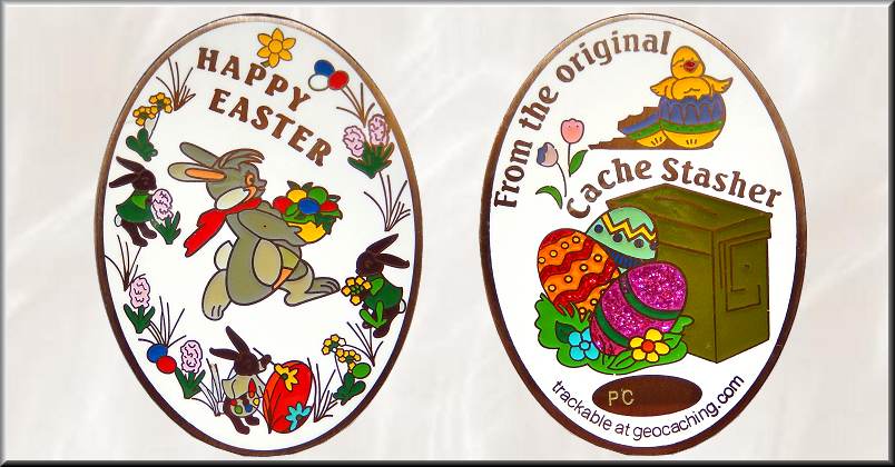 Easter Cacher Geocoin Antik Gold | Eine junge Familie, die seit drei Jahren im kanadischen Kamloops in British Columbia wohnte, entdeckte im August 2007 das Geocachen unter dem Account Theotokos. Besondere Freude hatten nicht nur die Kinder an den vielen Kleinigkeiten, die in den Caches zu finden waren. Ungewöhnlich war, dass Theotokos schon kurz nach dem Start des neuen Hobbys im Geocaching-Forum Kontakt zu anderen Cachern suchte und sich vor allem mit Fragen zu Travel Bugs und Geocoins beschäftigte. Deshalb ist es nicht verwunderlich, dass er sich dem Projekt "Team Geocache Hockey Geocoin" anschloss und im Oktober 2007 seine eigenen Hockey Geocoins mit der Nummer 94 erhielt. Kurz darauf startete Theotokos Anfang November 2007 sein erstes eigenes Coinprojekt mit der Ankündigung einer "FTF Christmas Coin" im Geocaching-Forum. Nach dem erfolgreichen Verkauf gab es Anfang Februar 2008 bereits die nächste Information im Geocaching-Forum. Pünktlich zu Ostern sollte eine neue "Easter Cacher Geocoin" erscheinen. Trotz der geschlossenen Münzstätten in China wegen des chinesischen Neujahrsfestes vom 06. - 12. Februar konnten die fertigen Münzen zwei Tage vor Ostern ab dem 21. März bei CH Quality Coins gekauft werden. Die 33 x 44 x 3 mm große Geocoin erschien in einer Auflage von 250 Stück in Antik Gold RE150, Black Nickel LE75 und Antik Silber XLE25. Mit einer filigran farbigen Hardemaille-Oberfläche und über 15 verschiedenen Farben, einschließlich durchscheinender und Glitzer-Färbung ist es eine schöne Ostermünze. In der Mitte der mattweißen Vorderseite läuft ein Hase mit einem Korb voller bunter Eier. Der Rand zeigt verschiedene Frühlings- und Ostermotive. Auf der Rückseite ist eine olivgrüne Ammobox mit drei verzierten Glitzereiern zu sehen. "HAPPY EASTER From the original Cache Stasher" ist auf der Münze zu lesen und weist darauf hin, die Coin als Geschenk des Owners für einen Cacher zu verstecken. Für mich ist es ein schönes Ostergeschenk von Kathleen aka amtg aus Florida, über das ich mich immer wieder freue. |