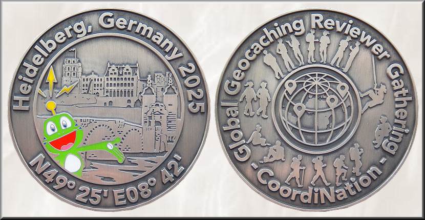 2007 wurde die allererste deutsche Reviewer Geocoin unter Federführung von Tupperman durch den Geocoinshop unter Mitwirkung von "Geocoindesign" (M. Bayerl, besser unter Mambo bekannt, Bruchsal) gestaltet und verkauft. Sie hat das Motto "Der Weg ist das Ziel", ist 1.75" (44 mm) groß und 3,5 mm dick. Damals waren in Deutschland gerade neun Reviewer ehrenamtlich für Groundspeak tätig, die sich zu einer Gemeinschaftscoin entschlossen hatten. Die Vorderseite zeigt einen grünen Kreis mit den Namen der Reviewer, umgeben von einem weißen Kreisring. Dies symbolisiert den Publish-Button, den die Reviewer beim Freischalten eines Caches betätigen. Die Coin trägt den außergewöhnlichen Namen „Published by…“. Die Rückseite zeigt Signal vor einer Deutschlandkarte, die mit den Farben Schwarz-Rot-Gold gefüllt ist. Im weißen, umlaufenden Ring steht "I love geocaching - Der Weg ist das Ziel." Die hier gezeigten Gold- und Black Nickel-Geocoins konnten im Gegensatz zur "Reviewer only"-Edition im Geocoinshop gekauft werden. Insgesamt wurden von den beiden „Published by…“-Editionen 334 Geocoins gemünzt. Die Reviewer erhielten die von ihnen bestellten Coins Anfang Dezember 2007. Der öffentliche Verkauf begann Anfang Januar 2008. Seit dem 24.04.2013 lag eine Coinkopie der Goldedition im Cache "Energiemix 7 - Biogas" und sollte dort bleiben. Das klappte aber nur bis zum 08.09.2013. Seitdem ist die Coinkopie auf Reise von Cache zu Cache. |