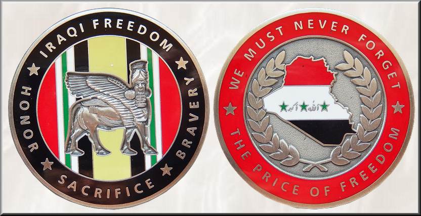 Iraqi Freedom Geocoin | Eine Gedenk-Geocoin zu Ehren der „Operation Iraqi Freedom“. Bringt unsere Kinder nach Hause. Vergesst nicht: In keinem Krieg gibt es Gewinner. Wäre es nicht schön, wenn dieser Geocaching-Container (GC) den Irak erreichen würde, wo Männer und Frauen der Welt dienen und gleichzeitig Geocaching betreiben? UPDATE: Ich habe gerade Münzen verschickt, und andere Geocacher aus Gainesville, Florida, haben „versteckfertige“ Caches an unsere Geocaching-Truppen im Ausland geschickt. Mögen sie etwas Freizeit haben und nach etwas Schönem suchen, anstatt nach etwas Lebensbedrohlichem. Mintmoonpi hat das „Care-Paket“ für ihren Bruder, der im Einsatz ist, zusammengestellt. Vielleicht könnten andere hier in den USA das Gleiche tun, um den Stress unserer Geocaching-Kollegen (und derer, die es bald werden) etwas zu lindern. Informationen zu diesem Artikel AMTG Iraqi Freedom GC 1 Große, schwere Münze. 4,45 cm Durchmesser, 3 mm dick, Antiksilber. Auch in anderen Metallfarben erhältlich. Die Trackingnummer befindet sich am Rand, daher gibt es keine Vorder- und Rückseite. Eine Seite besticht durch dezente 3D-Verzierungen und feine Emaille. Sie zeigt das Land Irak in Rot, Weiß und Schwarz. Im Zentrum befinden sich eine Inschrift und drei kleine Sterne. Das Metall im Hintergrund hat eine schöne Textur. Die Karte im Medaillon ist von einem Blätterkranz umgeben. Der Rand ist in mattem Rot emailliert und mit einer Randverzierung versehen. Die Inschrift lautet: „Wir dürfen den Preis der Freiheit niemals vergessen.“ Die andere Seite zeichnet sich durch herausragende 3D-Verzierungen und eine beeindruckende Emaille-Ausführung aus. Das Symbol des Irak, der Lamassu, ist als Relief sehr fein gearbeitet (sehr ungewöhnlich) und von Streifen in Rot, Weiß, Grün, Schwarz und im Dunkeln leuchtendem Gelb mit 3D-Randverzierung umgeben. Der schwarze Emaille-Rand trägt die Inschrift: „Irakische Freiheit – Ehre, Opferbereitschaft, Tapferkeit.“ Eine exzellente Münze. Informationen zur Münze: Die Geocoin „Irakische Freiheit“ ist ein Gedenken an alle Militärangehörigen und Zivilisten, die an diesem harten Feldzug teilgenommen und so viel geopfert haben. Die Vorderseite der Münze zeigt eine 3D-Abbildung einer Lamassu-Statue im Irak. Der Lamassu wurde im Assyrischen Reich (das große Teile des heutigen Irak und angrenzender Länder beherrschte) verwendet und repräsentierte einen Schutzgeist, der das Böse abwehrte und Chaos bekämpfte. Er wurde an Stadteingängen aufgestellt, und sein Gesicht blickte üblicherweise in eine der Himmelsrichtungen. Er symbolisiert den intellektuellen Menschen, den Mut eines Löwen und die Freiheit eines Adlers. Die Vorderseite der Münze zeigt die Farben der Militärmedaille. Die Rückseite zeigt das Land Irak mit den Farben der Flagge, die in die Form eingearbeitet sind. CoinsAndPins Diese Münze erinnert an den Irakkrieg. Ich habe sie an dem Tag aktiviert, an dem ich im Rahmen der Operation Northern Delay zum ersten Mal in den Irak geflogen bin. Eine lange, aber interessante Geschichte. Die Geocoin „Iraqi Freedom“ ist allen Militärangehörigen und Zivilisten gewidmet, die an diesem harten Einsatz teilgenommen und so viel geopfert haben. Die Vorderseite der Münze zeigt ein 3D-Bild einer Lamassu-Statue im Irak. Der Lamassu wurde im Assyrischen Reich (das einen Großteil des heutigen Irak und Teile angrenzender Länder beherrschte) verwendet und symbolisierte einen Schutzgeist, der das Böse abwehrte und Chaos bekämpfte. Lamassu-Statuen standen an Stadteingängen und blickten meist in eine der Himmelsrichtungen. Sie symbolisieren den Intellekt des Menschen, den Mut eines Löwen und die Freiheit eines Adlers. Die Vorderseite der Münze ist in den Farben der Militärmedaille gehalten. Die Rückseite zeigt das Land Irak mit den Farben der Flagge, die in die Umrisse eingearbeitet sind. Die Geschichte der Freiheit hat sich auf unserem Planeten viele Male wiederholt, und der Preis der Freiheit war stets mit Härten und Opfern verbunden. Möge der Lamassu auf dieser Münze weiterhin das Böse abwehren und das Chaos bekämpfen. | 11.04.2009 | Link |