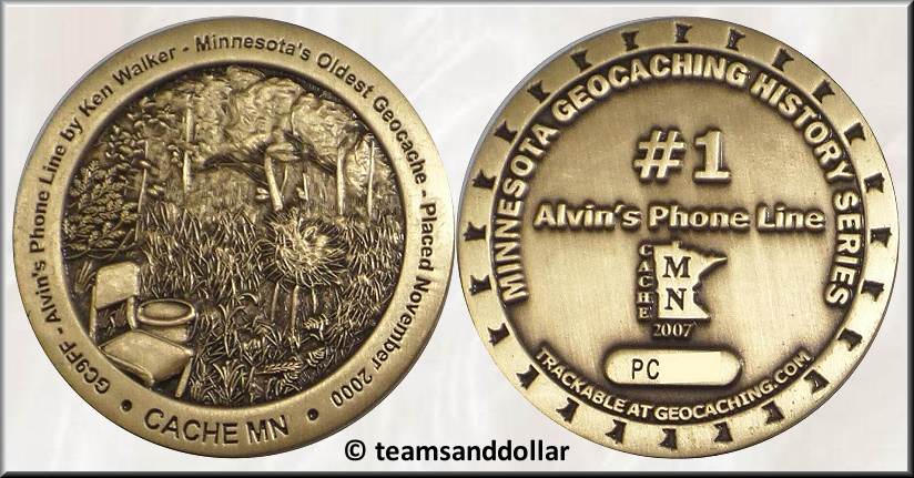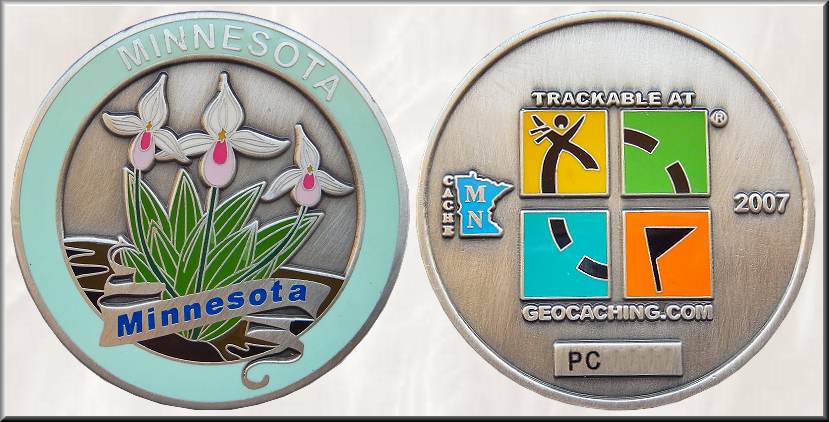 Minnesota State Symbols Series Geocoin "Lady Slipper" | In Isanti, einer Kleinstadt in Minnesota, entdeckte "merkman" aka Steve im Mai 2006 das Geocachen und fand schnell Freude an der Gestaltung von Geocoins. Bereits im September bot er seine erste "Cache MN Geocoin" im Geocaching-Forum in den beiden Editionen Silber RE300 und Gold LE200 zum Kauf an. Ein Jahr später stellte merkman die von ihm zusammen mit Rusty von www.personalgeocoins.com herausgegebenen "MN Geocaching History Series #1 - Alvin's Phone Line Geocoin" vor und auch die fast zeitgleich erschienene "Minnesota State Symbols Series Geocoin" mit den drei Motiven des Pracht-Frauenschuhs, bereits seit 1902 Staatsblume, des Seetauchers (Loon), 1961 zum Staatsvogel von Minnesota ernannt und des Glasaugenbarsches (Walleye), seit 1965 offizieller Staatsfisch. Die Geocoinserie ist ein Beispiel dafür, dass der kommerzielle Aspekt in der zweiten Hälfte der ersten Dekade der Geocoingestaltung eine immer größere Rolle spielte. 500 Trackingcodes wurden für die Serie gekauft, um in der Zeit ein eigenes Icon erhalten zu können. Bei gleichem Rückseitendesign (dem farbigen Groundspeaklogo, links ergänzt um eine kleine Karte Minnesotas mit dem integrierten Staatskürzel MN und rechts der Jahreszahl 2007) erschien die "Lady Slipper" (Frauenschuhcoin) in 8 unterschiedlichen Metalleditionen, die "Loon" und die "Walleye" in je 5 Editionen. Damit war die in der Fertigung wohl recht preiswerte Coinserie eigentlich völlig den Sammlern vorbehalten. Die hier vorgestellte 44 x 4 mm große Antik Silber-Geocoin mit farbiger Hardenameloberfläche zeigt auf der Frontseite eine Frauenschuhpflanze mit drei Blüten, zusammengehalten mit einem Band, auf dem Minnesota steht. Im großen mintgrünen Umkreis wiederholt sich der Name des Bundesstaates. Steve unterstützte auch die MnGCA (Minnesota Geocaching Association) bei der Gestaltung ihrer ersten auf gc.com trackbaren "2007 MnGCA Geocoin", die auf einer Seite der ersten MnGCA-Coin von 2006 glich. 2007 - 2008 war er Schatzmeister der MnGCA. Im Sommer 2008 beendete merkman bereits wieder seine Cacheaktivitäten. Vielen Dank an Grey Wolf and Wild Rice aus dem Großraum Minneapolis in Minnesota, von denen ich diese Geocoin im Rahmen eines Tausches bekam. |