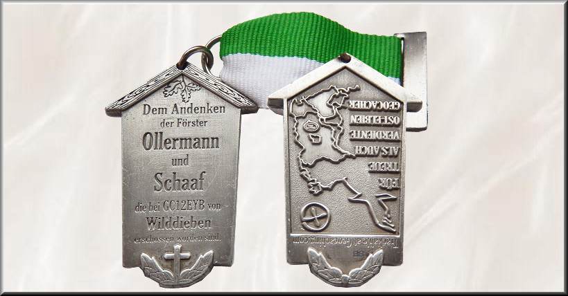 Ollermann - Geocoin | Unter dem Nick CaptainF tauchte im Juni 2003 ein neuer Cacher im südlichen Brandenburg auf. Im gleichen Jahr veröffentlichte Falko bereits seine ersten 4 Caches, die einige seiner besonderen Vorlieben dokumentieren: lange Wanderungen in der Natur, heimatgeschichtliches Interesse, Multis. Da Reisen für CaptainF nicht nur Hobby war, schaute er auch beim Cachen schnell über die Homezone hinaus und lernte beim "1. CITO Berlin", in Hessen beim "Winter-Schnee?- Cache Event Klosterstein" oder beim "3. Leipziger Event" viele besonders engagierte Geocacher kennen. So entwickelte sich langsam die Idee, selbst ein Event vorzubereiten, das den teilnehmenden Cachern nicht nur die Möglichkeit des Gedankenaustausches bot sondern auch noch die Freude am Suchen und Finden toller Caches. Am 12.05.2007 startete mit 11½ Teilnehmern das 1. Ost-Elbien-Event. In Vorbereitung darauf hatte Falko 10 Geocaches gestaltet, die die Besucher in die Geschichte der Region eintauchen oder sie bei richtiger Lösung zum Millionär werden ließen. Im Laufe des Eventtages waren die Teilnehmer mit "Dem herumziehenden Jäger" einem Wilddieb auf der Spur, gingen mit "Förster Schaaf auf Pirsch", suchten die "Zwei Mordsäulen in der Rochauer Heide" und statteten "Ollermanns Grab" einen Besuch ab. Beim abendlichen Zusammensein im Gasthof "Zum wilden Eber" gab es wahrscheinlich die ersten Ideen zur Gründung des "Vereins für Geocaching in der Rochauer Heide" unter dem Vorsitz von CaptainF. Voller Begeisterung schwärmten die Teilnehmer noch Jahre später von den gut ausgearbeiteten Caches mit einer spannenden Rahmenhandlung in einer schönen Landschaft. Das war für CaptainF natürlich Ansporn, zwei Jahre später vom 14. - 16.08.2009 das 2. Ost-Elbien-Event zu organisieren, das am Freitag bereits mit einem Anreise Event startete. Neben den eingeladenen Teilnehmern am ersten Treffen und weiteren Cachern, die eine Wildcard bekamen, hatten noch 60 Cacher das Glück, am platzmäßig begrenzten Event teilnehmen zu können. 30 neue Multis und Mysterys auf den Spuren von Jetzschmanns Tochter und Schneidermeister Ihmes Lehrling Beleé warteten im CaptainF-Land, der Rochauer Heide, zwischen Luckau und Hohenbucko darauf, gefunden zu werden. Eine extra Cachebroschüre, liebevoll mit den notwendigen und ergänzenden Informationen gestaltet, wurde den Teilnehmern bei Anreise ausgehändigt. Bei bestem, recht warmen Wetter erlebten die Teilnehmer ein tolles Cachewochenende. In den gelesenen Logs werden immer wieder die unglaubliche Mühe bei der Vorbereitung bis ins Kleinste, die interessanten Cachegeschichten mit vielen wunderschönen Details, feine Versorgungsstellen, die vielen Caches hervorgehoben. Die folgende Mundpropaganda führte dazu, dass vor allem Cacher aus Halle die Bitte an Falko richteten, ein weiteres Eventwochenende zu organisieren. Tatsächlich fanden dann ein Jahr später am 18. und 19. Juni 2010 zwei Events Ost-Elbien > Das Camp zur Nachsuche und Ost-Elbien > Die offizielle Nachsuche statt, wobei es nicht nur um die Nachsuche ging, denn CaptainF hatte zu diesen Events 10 neue Multis und Mysterys gestaltet. Am 28. Februar 2011 veröffentlichte der "Verein für Geocaching in der Rochauer Heide" das "Einberufungsschreiben" für das 3. Ost-Elbien-Event vom 26. - 28.08.2011. Innerhalb kurzer Zeit war das Wochenende ausgebucht. Über 50 neue Caches hatte CaptainF vorbereitet. Aktiviert wurden alle am ersten Eventtag. Mit dem Tradi "Ost-Elbien-Cacher-Guide", der eine in Gruppen zusammengefasste Auflistung von Caches im CaptainF–Land und der Umgebung enthält, wollte es Falko auch ortsunkundigen Geocachern ermöglichen, erfolgreiche Einsätze durchzuführen. Neben den bereits aus früheren Ost-Elbien-Events bekannten Highlights gab es noch eine besondere Überraschung: die Auszeichnung verdienstvoller Teilnehmer an den "Ost-Elbien-Events" mit der "Ollermann-Medaille am grün-weißen Ordensbande", zusammen mit einer würdigen Urkunde verliehen von CaptainF, Vorsitzender des "Vereins für Geocaching in der Rochauer Heide". Einzelheiten zur Vergabe der Ollermann-Medaille können im Extrablatt der Vereinszeitschrift vom 27.08.2011 nachgelesen werden. Der in Form einer Gedenktafel gestaltete 34 x 50 x 4 mm große Orden in Antik Silber erinnert an die Ermordung zweier Förster durch Wilddiebe. So steht auf der Frontseite: "Dem Andenken der Förster Ollermann und Schaaf die bei GC12EYB von Wilddieben erschossen worden sind." Auf der Rückseite ist kopfstehend das Logo des 3. Ost-Elbien-Events zusammen mit dem Text FÜR TREUE ALS AUCH VERDIENSTE OST-ELBIEN GEOCACHER abgebildet. Zusätzlich gibt es noch für besonders verdienstvolle Träger der Ollermann-Medaille, z. B. der Teilnehmer am "1. Ost-Elbien-Event", die Auszeichnung mit der Ehrentrophäe zur Ollermann-Medaille, eine silberne Anstecknadel in Form eines Hirschkopfes, zu tragen am grün-weißen Ordensbande. Gefertigt wurden 250 Medaillen und 51 Ehrentrophäen. Im Listing des Mysterys "Ordensrat" sind viele weitere Informationen zu finden. Da die "Ollermann-Medaille am grün-weißen Ordensbande" so eng mit der Geschichte der Ost-Elbien-Events verknüpft ist, soll diese auch bis zum Ende erzählt werden. Am 08. Januar 2012 erschien das "Einberufungsschreiben" für das vom 13. - 15.07.2012 geplante "Ost-Elbien Nachsuche 2012"-Event, welches innerhalb weniger Stunden ausgebucht war, denn inzwischen hatte die Eventreihe unter Geocachern einen überregionalen Kultstatus erreicht. So ist z. B. in einem Logeintrag zu lesen: Vor Monaten bekam ich einen Hinweis von meinem guten Freund Temu_Dshin (✟ 22.04.2021) aus Wien das es sich hier um ein Kult-Event handeln soll und das er die weite Reise aus Wien auch antreten wird. Es wurde das letzte Event dieser Art, das auf gc.com veröffentlicht wurde und geloggt werden konnte. Die genauen Gründe sind mir nicht bekannt, doch wurde in Cacherkreisen erzählt, dass es Probleme bei der Eventveröffentlichung gab, weil ein