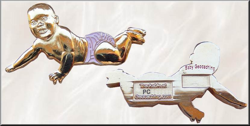 Baby Geocoin | Seit Juni 2005 ist der finnische Cacher Fundamental aus Tampere aktiv. Schon wenige Wochen nach seinem Cachestart begann er mit dem Kauf von Geocoins. Dabei war sein Hauptziel nicht das Sammeln sondern das Ablegen in Caches, denn in jener Zeit gab es in Finnland noch keine Coinsammler und so wanderten seine Coins unbeschadet von Cache zu Cache. Bereits im September machte sich Fundamental erste Gedanken über eine eigene Geocoin und stellte dazu im Geocaching-Forum verschiedene Fragen. Am 22. Dezember 2005 war es dann soweit, Fundamental stellte im Geocaching-Forum seine erste selbst gestaltete "Cat Geocoin" vor, die Mitte Februar 2006 veröffentlicht wurde. Damit war es nach der ersten finnischen Geocoin, der Finland Geocoin, die nur rund drei Wochen vorher erschien und für die Fundamental zumindest teilweise verantwortlich war und zwar für den Verkauf, bereits die zweite Münze in Finnland. Zur gleichen Zeit entstand die "Fundamental and Venlis Geocoin", die am 07. März 2006 in einer Auflage von 300 Coins mit den beiden Editionen 250 Stück Antik Silber und 50 Stück Antik Bronze erschien. Dort verkörpern die Silhouetten dreier Personen unter den Wappen die junge Cacherfamilie, wobei ihr Sohn Santtu zur Zeit der Erstausgabe gerade mal 6 Monate alt war. Der stolze Vater hatte bald darauf die Idee, eine Geobaby Geocoin zu gestalten, die für alle Geocaching-Babys weltweit gedacht war. Also entwarf Fundamental die hier vorgestellte Geocoin und stellte sie erstmals am 02. Juli 2006 im Geocaching-Forum vor. Sie ist seinem kleinen Sohn Santtu nachempfunden, der mit 5 Monaten mit den Eltern die erste Geocaching-Tour unternahm, aber bereits im Alter von 5 Tagen seine erste Geocoin fand. CHQuality Coins übernahm die Fertigung und den Verkauf der fertigen Münzen ab dem 19. September 2006. Die 44 x 25 x 3 mm große Geocoin in Form eines krabbelnden Babys erschien zu je 100 Stück in Glänzend Gold mit den Windelfarben hellblau und pink. Zusätzlich wurden 50 Coins in Satin Gold mit weißer Windel gefertigt. Die 3D-Darstellung auf der Vorderseite ist für die Größe recht gelungen. Die Rückseite trägt neben den Trackinginformationen nur die Gravur „Baby Geocaching“. Die Geocoin ist ein Geschenk der Cacherin amtg aus Florida - vielen Dank dafür. |