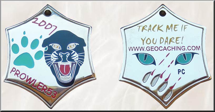 Prowler53 2007 Geocoin | Der nur von September 2005 bis 2007 aktive Cacher Prowler53 aus Minersville in Pennsylvania hatte eine Vorliebe für Raubkatzen und Geocoins. Am 27. April 2007 begann er für seine neue hier vorgestellte "Prowler53 2007 Geocoin" im Geocaching-Forum zu werben, die dann Mitte Juni bei den Bestellern eintrafen. Die Geocoin ist ein Geschenk der Geocoinliebhaberin amtg aus Florida - vielen Dank dafür. |