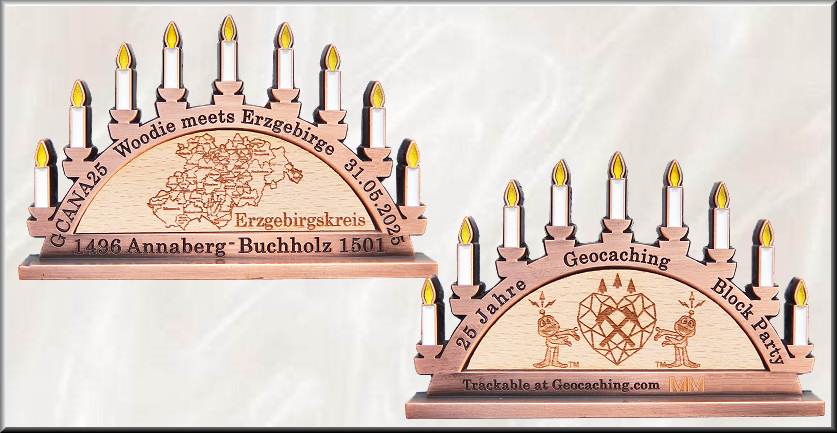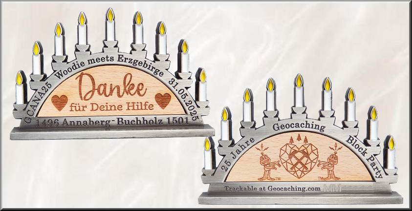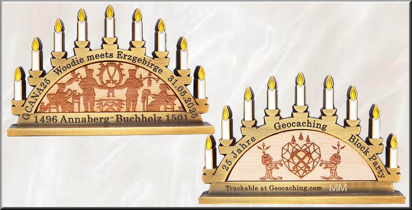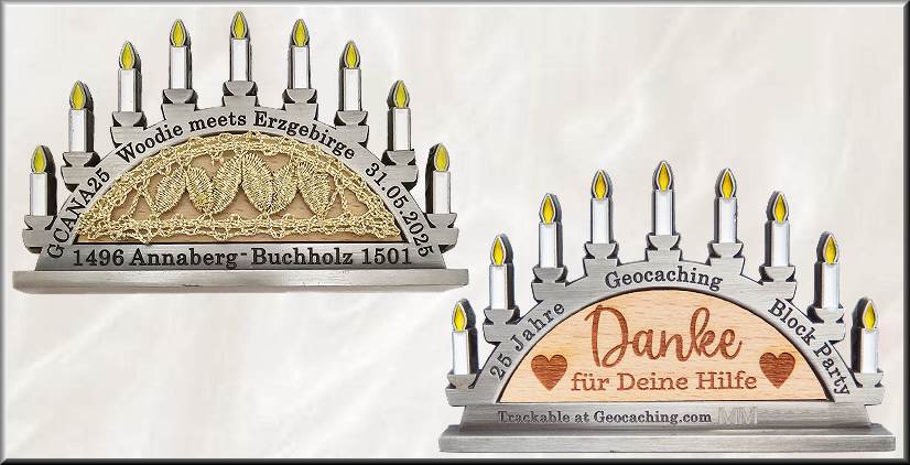 Woodie meets Erzgebirge Geocoin | Am 31. Mai 2025 fand in Annaberg-Buchholz die Geocaching HQ Block Party „Woodie trifft Erzgebirge“ statt, die für uns im Zentrum einer Geocachingwoche im Erzgebirge stand. Die Stunden auf dem Eventgelände vergingen wie im Fluge mit dem Lösen der Labcacheaufgaben, dem Bummel von Stand zu Stand und dem Treffen mit vielen Freunden. Interessant war das Zuschauen beim Drechseln, das Stöbern und Schnuppern beim Räucherkerzenmacher und und und .... An dieses schöne Event wird uns immer die Eventcoin, gefertigt über den LaserLogoShop, in Form des typischen Erzgebirge-Schwibbogens erinnern, die mit ihrem eingelegten Holzfurnier auf beiden Seiten das Woodcoin-Thema, die regionale Geschichte und 25 Jahre Geocaching perfekt verknüpft. Der 80 x 48 x 5 mm große Schwibbogen mit den 9 im Dunkeln leuchtenden Kerzen steht auf einem 80 x 12 x 3 mm großen Sockel. Auf dem Kerzenbogen stehen vorn der Eventcode, der Eventtitel und das Eventdatum, hinten "25 Jahre Geocaching Block Party". Unten steht links und rechts neben den Stadtnamen der Doppelstadt das jeweilige Gründungsjahr. Die gelaserten Grafiken auf dem eingelegte Holz zeigen einmal ein typisches Schwibbogenmotiv mit zwei Bergleuten, einem Schnitzer und einer Klöppelfrau, dann eine Silhouette der Berg- und Adam-Ries-Stadt, weiter eine Karte des Erzgebirgskreises und bei der Helfercoin den Schriftzug "Danke für Deine Hilfe". Im Rückseitenfurnier ist in allen 4 Editionen Antik Gold LE90, Black Nickel RE120, Antik Kupfer LE90 und der Helfercoin in Antik Silber LE70 das Logo der Block Party eingelasert. Für das Orga-Team wurden 10 besondere Antik Silbercoins gefertigt. Sie haben auf einer Seite eine in Handarbeit gefertigte Klöppelspitze eingepasst. Zusätzlich wurden auf dem Event drei Sample-Coins in Black Nickel, Antik Gold und Antik Kupfer mit Klöppelarbeit auf einer Seite versteigert, zusätzlich noch eine Black Nickel-Errorcoin. Von den 500 bei Groundspeak gelisteten Trackingcodes wurden also 380 für Geocoins verwendet, 12 für T-Shirts und die restlichen fanden eine andere Nutzung.Vielen Dank an Swen vom Orgateam für die Bereitstellung spezieller Informationen und die Fotos der AE-Coin. |