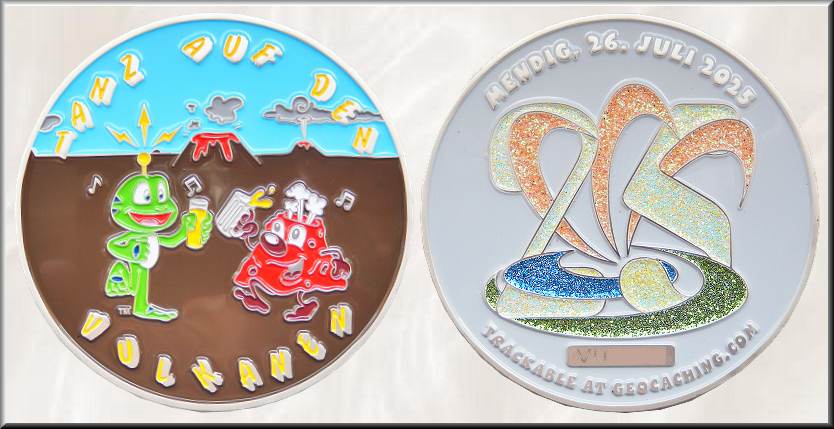Zum 25. Geocachingjubiläum hatte das diesjährige Event-Team eine ganze Eventwoche mit 8 Einzelevents vorbereitet. So war also von Mittwoch bis Sonntag immer was los. Wir starteten unsere Eventreihe mit dem Besuch des CCEs "#1 Möge der Tanz beginnen", setzten am Donnerstag früh mit "#2 Lavaduft am Morgen" fort und beendeten den Tag mit dem Besuch von "#3 Die Erde bebt". Da wir uns am Freitag ein umfangreiches Cacheprogramm vorgenommen hatten, waren wir erst wieder am Abend bei "#5 Der Vulkan brodelt" dabei. Dort konnten wir auch die hier vorgestellten Eventcoins in Empfang nehmen. Die von Groundspeak zur Verfügung gestellten 500 Trackingcodes wurden für die Black Nickel RE250, die Antik Silber LE100, die Supporter Satin Silber XLE50 genutzt sowie für einen trackbaren Helfer-Token und T-Shirts. Die Softenamel-Coins, gestaltet vom deutschen Grafiker und Geocoin-Designer Jascha Buder aka Bruder JaB, haben einen gigantischen Durchmesser von 70 mm und sind 5 mm dick. Gefertigt wurden sie über den LaserLogoShop. Auf der Frontseite der Geocoin prosten sich Signal und Vulkanius, das Maskottchen des Mendiger Events, in einer braunen Vulkanlandschaft mit Bier zu. Umlaufend sind "tanzende" Buchstaben zu sehen, die die Worte "TANZ AUF DEN VULKANEN" ergeben. Im Zentrum der Rückseite steht das bekannte Mendiger Eventlogo, gebildet aus farbigen Streifen, verknüpft mit einer 25, die an 25 Jahre Geocaching erinnert. Bei der Supporter-Geocoin ist die Grafik auf der Rückseite mit Glitterfarben gefüllt. Das Jubiläum feierten wir dann am Samstag bei der Block Party "Tanz auf den Vulkanen" auch zusammen mit hunderten anderen Cachern ausgiebig. Ein besonderer Höhepunkt war am Nachmittag die Teilnahme an der großen Geocoinausstellung "#6: 25 Jahre Geocoins (CCE)". Als einer der Aussteller waren wir überrascht vom großen Interesse an den Münzen, die in ganz unterschiedlichen Arten präsentiert wurden. Auch die beiden letzten Events "#7 Wir schaffen Platz für neue Blumen" und "#8 Der Vulkan erlischt" am Sonntag waren gut besucht. So wollen wir uns zum Schluss nochmals für die tolle Organisation und die abwechslungsreiche Gestaltung beim Orga-Team herzlich bedanken. |
