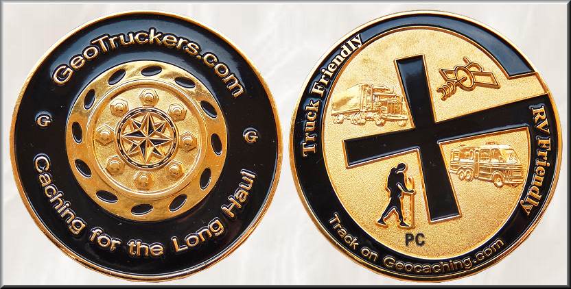 GeoTruckers Geocoin | Am 01. Juni 2006 kündigte geotruckers.com im Geocaching-Forum die Herausgabe einer eigenen Geocoin vor allem für die Mitglieder des „Trucker-freundlichen“ Geocaching-Clubs für Lkw-Fahrer und Wohnmobilisten an. Der Club lieferte damals die Plattform für die Suche nach mindestens 21 Meter langen Parkplätzen zum Geocaching und pflegte eine umfangreiche Liste mit fast 600 Caches bundesweit, die alle von den Clubmitgliedern eingereicht wurden. Innerhalb der über 100 aktive Mitglieder zählenden Gruppe gab es eine gegenseitige Unterstützung bei der Pflege der von ihnen platzierten Caches. Bereits wenige Tage zuvor verkaufte der Club die neue 50 x 4 mm große, von coinsandpins.com gefertigte Geocoin in den beiden Editionen Nickel RE400 und Glänzend Gold LE200 an seinem Stand auf dem MEGA "GeoWoodstock 4", das am 27. Mai auf dem Gelände des Cedar Hill State Parks nahe Dallas in Texas stattfand. Gestaltet wurde die Vorderseite von 9Key, einem bereits seit März 2002 aktiven Cacher und Geocoinliebhaber aus Dallas, die Rückseite von Grumpster aus Bastrop in Texas, der als Cacher von 2005 bis 2010 aktiv war. Die Front ist einem LKW-Reifen nachempfunden. In der Nabe der Radkappe befindet sich eine Kompassrose. Acht Radmuttern sind den vier Haupt- und vier Nebenhimmelsrichtungen zugeordnet. Der breite, schwarze Emaillerand trägt die Metallinschrift „Caching for the Long haul“ und „GeoTruckers.com“. Die Rückseite besticht durch ihre schöne Metallstruktur im Hintergrund. Ein großes, schwarzes Emaille-„Gx“ mit den Schriftzügen „Truck Friendly“ und „RV Friendly“ ist zu sehen. Die Abbildungen in den durch das "Gx" gebildeten Teilflächen repräsentieren die verschiedenen Bereiche des Clubs: ein Sattelzug für die Lkw-Fahrer, ein Wohnmobil für die Camper, ein Satellit und ein Wanderer für den Geocaching-Sport. |