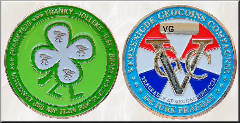 Ende des Sommers 2006 gab es im niederländischen GC.nl-Forum eine Diskussion zur Gestaltung eigener Personal-Geocoins. Die Kosten für das Prägen von Geocoins waren damals ziemlich hoch. Und Groundspeak verkaufte die Tracking-Nummern nicht unter 1000 Stück. Schließlich fanden sich 11 CacherInnen, die im Rahmen eines ersten niederländischen Projektes unter dem Namen "Vereenigde Geocoins Compagnie" (VGC), welches vom niederländischen Geocacher und Coindesigner KarelKraak initiiert wurde, die Front ihrer eigenen Geocoin gestalteten, während die Rückseiten aller Coins im Projekt die gleiche Gestalt hatten. Auch das bei Groundspeak gelistete Geocoinicon und das Präfix sind bei allen Coins gleich. Die Rückseite der 42 x 3,5 mm großen Geocoins zeigt die Buchstaben VGC vorne und die niederländischen Flaggenfarben im Hintergrund. VGC erinnert an die VOC, die Niederländische Ostindien-Kompanie. Die VOC war ein gechartertes Unternehmen, gegründet im Jahre 1602. Die Generalstaaten der Niederlande gewährten ein 21-jähriges Monopol zur Durchführung von kolonialen Aktivitäten in Asien. Es war der erste multinationale Konzern in der Welt und das erste Unternehmen, das Aktien heraus gab. Die Rückseite ist von einem blauen Rand mit dem Text "Vereenigde Geocoins Compagnie" und "De Iurie Predea" eingerahmt. Es ist der lateinische Titel eines Buches von Hugo de Groot über das Recht auf Beute. Die folgenden VGC 2006 Geocoins wurden während dieses Projekts geprägt und erschienen Ende November 2006: VGC 2006 Geocoin - Franky639 (drei Versionen) VGC 2006 Geocoin - KarelKraak (vier Versionen) VGC 2006 Geocoin - MADpalace en de schattige zoeker (drei Versionen) VGC 2006 Geocoin - MVS Team Pooh (zwei Versionen) VGC 2006 Geocoin - Saffier (zwei Versionen in Silber RE75 und Gold LE25) VGC 2006 Geocoin - Team Delta123 (drei Versionen) VGC 2006 Geocoin - Mathlener (eine Version) VGC 2006 Geocoin - Team Wolfje (fünf Versionen) VGC 2006 Geocoin - TuuronTour (drei Versionen) VGC 2006 Geocoin - Wij Drie (zwei Versionen) VGC 2006 Geocoin - Wilg (zwei Versionen) Aus Florida kam diese Geocoin als Geschenk von der Cacherin und Coinsammlerin amtg aka Kathleen ins Oderland, um die Serie der VGC Geocoin 2006 zu vervollständigen. Es ist die Personalcoin vom Cacher Franky639 aus Noord-Brabant, der seit März 2003 zuerst zusammen mit seiner Frau Jolanda, später auch mit seinen Kindern Ilse und Bram sowie mit Cacherfreunden, darunter Delta123, auf Dosensuche ging. Für die Front seiner VGC Geocoin hatte sich Frank ein Glücks-Kleeblatt passend zu seiner 4-köpfigen Familie ausgewählt. So sind umlaufend neben dem Nicknamen auch die vier Namen Franky, Jolleke, Ilse und Bram sowie der Wohnort Oosterhout nordöstlich von Breda und die Koordinaten N51° 37.226 E004° 51.437 ihres Wohnhauses zu finden. Am Projekt beteiligte er sich mit den drei Editionen Nickel LE60, Antik Bronze XLE20 und Poliert Gold XLE20. In den letzten Jahren trat bei franky639 die Cachesuche immer mehr in den Hintergrund. |