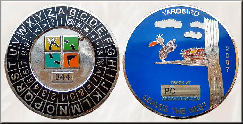 Personal Geocoin 67yardbird #44 | Die hier vorgestellte Personalcoin von 67yardbird aus Eddyville in Iowa, seit Februar 2007 bei Groundspeak registriert, erzählt einen Teil der Geschichte, wie 67yardbird überhaupt zum Geocaching kam: Eine kleine Münze mit einem Drehteller in der Mitte, die ich zufällig fand, brachte mich überhaupt erst zum Geocaching. Ich war total fasziniert von diesen Geocoins, die man „tracken“ konnte, und habe mir ein paar gekauft. Ich habe mir die Geocaching-Website angesehen, war aber etwas skeptisch, mich anzumelden, obwohl ich total begeistert war. Deshalb habe ich die Anmeldung ein paar Monate hinausgezögert. Nachdem ich aber ein paar dieser tollen Geocoins hatte, wusste ich einfach, dass ich unbedingt selbst eine erstellen musste. Aber wie sollte ich eine eigene Geocoin erstellen, ohne Geocacher zu sein? Ich musste nicht lange überlegen, bis mir klar wurde, dass ich endlich aufhören musste, alles aufzuschieben. Also meldete ich mich bei geocaching.com an. Kurz darauf besorgte ich mir ein sehr zuverlässiges GPS-Gerät und fand mit meiner Familie meinen ersten Geocache "Eddyville Sand Prairie", nur 1,1 Kilometer von zu Hause entfernt. Dann traf ich meinen ersten Geocacher (einen Bären in seinem Garten). Anschließend besuchte ich mein erstes Event (von mrring) und lernte weitere nette Geocacher kennen. Dann kamen meine neuen, glänzenden Geocoins per Post an. Sie waren fantastisch, und ich rannte sofort los, um sie an die wunderbaren Menschen zu verteilen, die es so gründlich geschafft hatten, mich süchtig danach zu machen. Zur genauen Entstehungsgeschichte wurden keine Informationen gefunden. Die fertigen Geocoins, hergestellt über Oak Coins, erhielt 67yardbird bereits Ende Juni 2007. Gemünzt wurden nur 56 Geocoins: 30 in Gold, 15 in Nickel, 5 in Kupfer und 6 Muster. Die schwere Nickelmünze ist 44 x 3,5 mm groß und hat auf der Vorderseite zwei Kreisringe. Dem äußeren mit den 26 Buchstaben wird ein innerer mit den Ziffern und Symbolen auf einer Standardtastatur zugeordnet, ähnlich wie bei einem ROT-Entschlüsselungswerkzeug. In der Mitte sind das offizielle Groundspeak-Logo und die individuelle Münznummer 44 zu sehen. 67yardbird nutzte die neue Geocoin als Grundlage für seinen einzigen Multi: "yardbirds coded cache". Die Rückseite erinnert an den Einstieg der Familie ins Geocaching und enthält ein paar versteckte Symbole. Zu sehen ist auf blauem Hardenamel-Hintergrund ein kleiner, cartoonartig dargestellter Vogel auf einem Ast, der das Nest verlässt. Die Randinschrift lautet „YARDBIRD 2007 LEAVES THE NEST“. Diese seltene Personalcoin stellte amtg als Geschenk für das online-Projekt "Kleine Geschichten aus den ersten Geocoinjahren" zur Verfügung - vielen Dank dafür. |