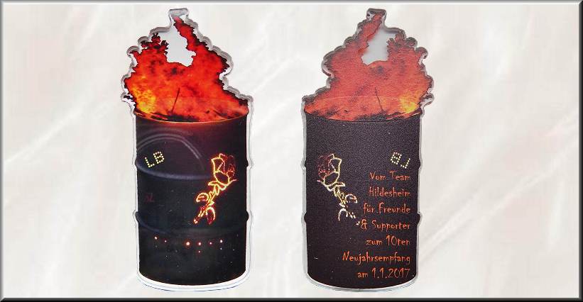 Im Sommer diesen Jahres traf ich den bereits seit September 2004 aktiven Geocacher A-Towner aka Florian während der 19. Deutschen Geocaching Meisterschaft in Cottbus im Alten Münzturm. Wir kamen über die vor Ort zu sehenden alten Geocoins ins Gespräch und ein paar Wochen später bekam ich ein ganz besonderes Münzgeschenk: zwei Geocoins der 12. Deutschen Geocaching Meisterschaft. Dabei war auch ein Token der hier vorgestellten "Hildesheimer Taschen(feuer)Tonne", die zum 10ten Neujahrsempfang am 01. Januar 2017 vom Team Hildesheim als ein kleines Danke an alle Freunde und Supporter verschenkt wurde. Team Hildesheim, gegründet im Dezember 2005, ist eine kleine Gruppe aktiver Cacher (Droque, A-Towner, fadpfinder, BuschmannBoB und walliman), die sich fanden und seither nicht nur ein perfektes Team bilden sondern gemeinsam Aktivitäten für die regionale Community organisieren. So lieferte die originale Feuertonne bereits beim verflixten 7. Neujahrsempfang am 01.01.2014 wohlige Wärme. Den kleinen "Taschenwärmer" fertigte die LASERBU.de in einer Größe von 35 x 72 x 3 mm an. |