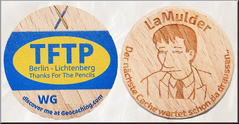 GeoHex-Token | Diese "Visitenkarten"-Holzcoin fanden wir in einem Cache nahe Bad Saarow. Sie werden GeoTimber genannt und können über den GeoCoinshop bestellt werden. Ungewöhnlich ist, dass sie das gleiche Größenmaß haben wie die GeoTimber, die wir in den USA gefunden haben. Damit sind sie im Vergleich zu den europäischen CWG (Czech Wood Geocoin) größer aber dünner. Leider konnte der GeoTimber bisher keinem Berliner Cacherteam zugeordnet werden. Zwar gibt es GeoHex in Berlin, doch ihnen gehört dieser Timber nicht. |