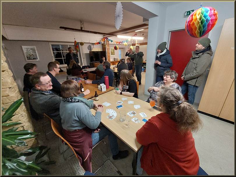 | Danach gestaltete sich der Abend wie gewohnt: Es bildeten sich Spielgruppen, die Rommé, Skat und andere Kartenspiele spielten, sowie Klönrunden. In der Mitternachtsstunde leerte sich so langsam unser Clubraum, denn ein paar erholsame Stunden Schlaf sollten vor der Wanderung noch sein. Am nächsten Morgen trafen wir uns alle zum Frühstück im Speiseraum. Es folgten die üblichen Vorbereitungen zur Wanderung. |